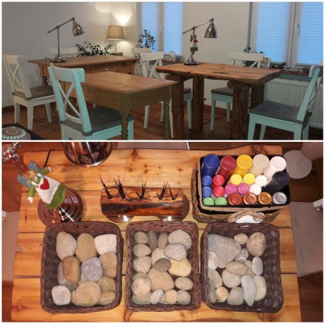 Schöne Steine, Farben und Pinsel habe ich da für Dich.