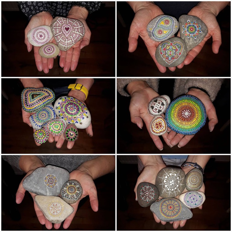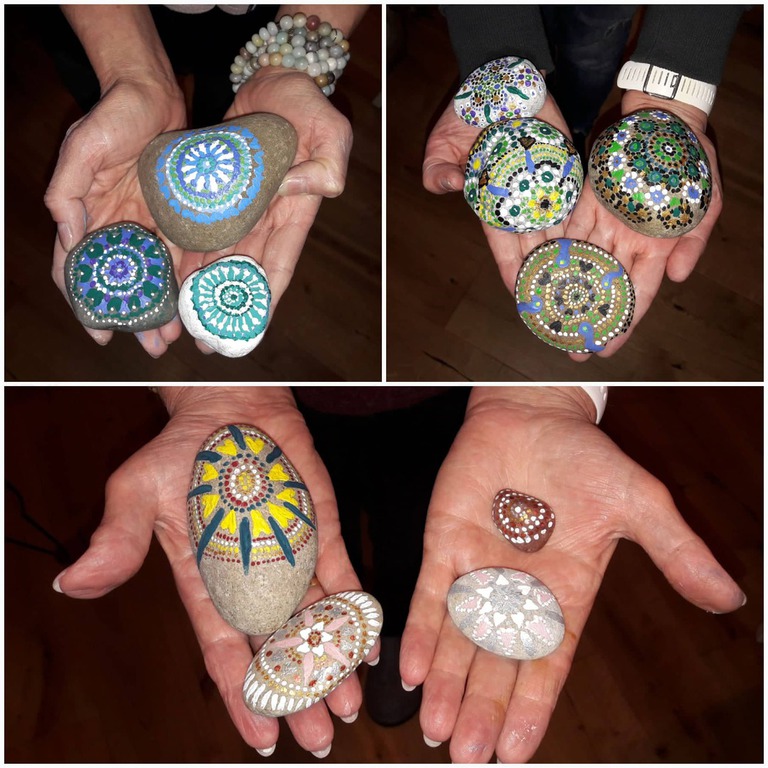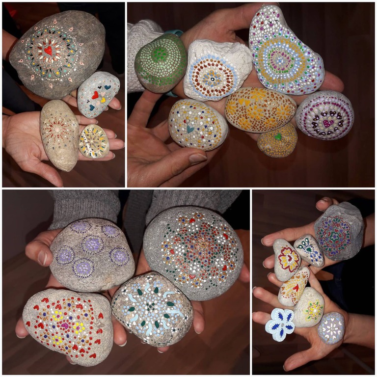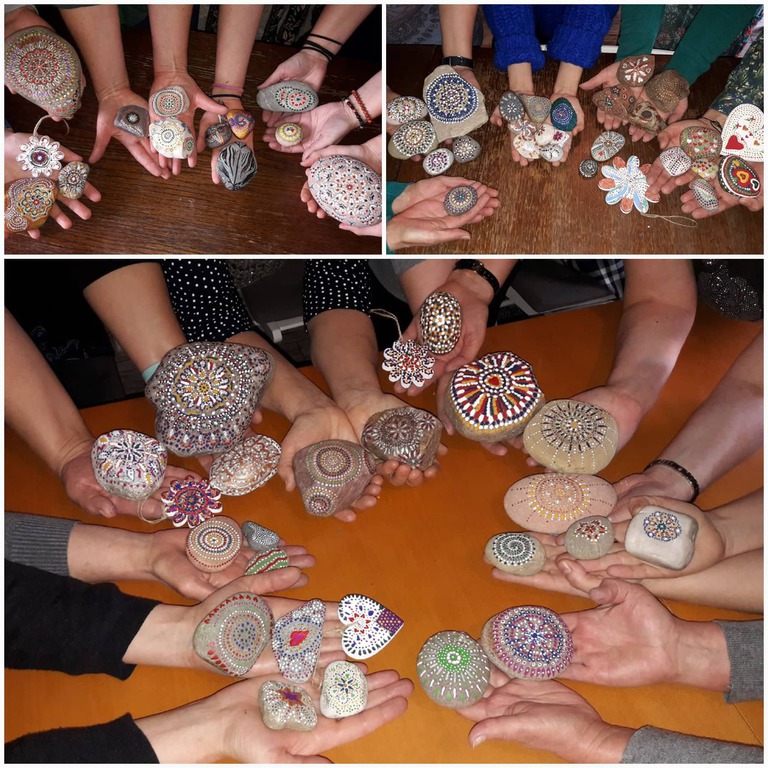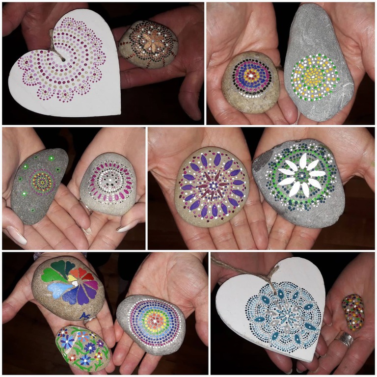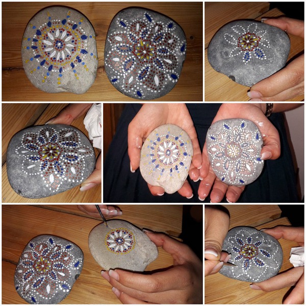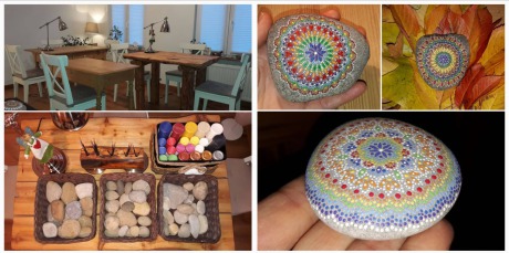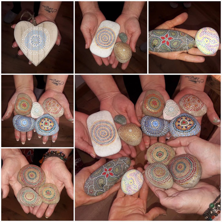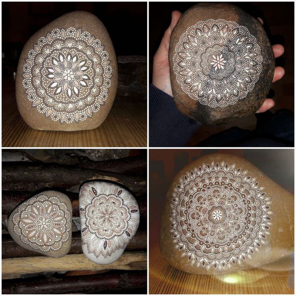Dzieci i Mandale zmieniły moje Życie. Jak dzieci były jeszcze bardzo małe, malowałam wzory na karteczkach, szybko czułam, że zataczałam kręgi dookoła mojego własnego centrum i odczuwałam niesamowity relaks... dobrze mi robił pomiędzy zajęciami dnia, stertami ubrań do prania i różnymi wyzwaniami... Malowałam coraz wiecej i bardziej kolorowo... gdy tylko dzieci były kreatywne, siadałam i malowałam od kropki do kropki, od kręgu do kręgu... na kartkach... na płótnie... na pierwszych kamieniach... każdego wieczoru zatapiałam się w kręagch nastepnych Mandali... odpoczywałam do głębi... zaczełam malowac dla innych... od Duszy dla Duszy... ale poczułam, że nie ma ważniejszej Mandali niż tej Własnej... zaczęłam tworzyć przestrzeń podczas warsztatów, w której każdy mógł doświadczyć... tego niesamowitego zatrzymania, zatapiania się w siebie... tak siedzimy razem... każda ze swoim kamieniem i sobą na chwile sama... a cisza łączy nas wszystkie... Poprzez malowanie Mandali nauczyłam się być... być we i ze wszystkim, co mi Życie dało w darze... szczęście i cierpienie... pokorę i zaufanie... Gdy patrzę na te wszystkie Mandale, wzruszam się i czuję wdzięczność. Jest najpiękniejszą medytacją dla mnie i polecam ją każdemu. Nie potrzeba wiele... tylko KAMIEŃ, PĘDZEL, FARBY i CIEBIE...