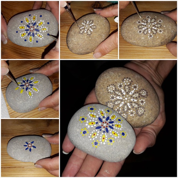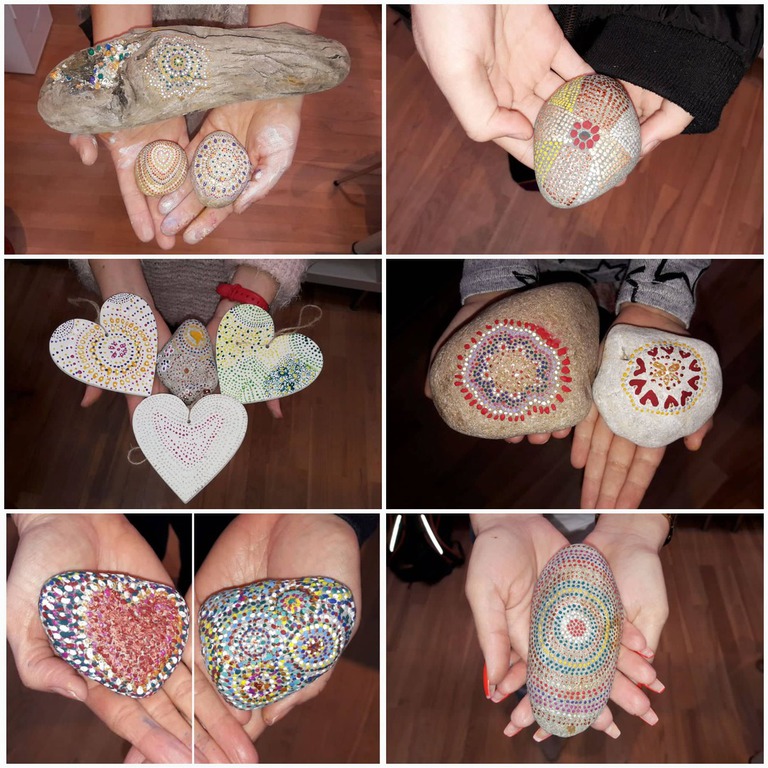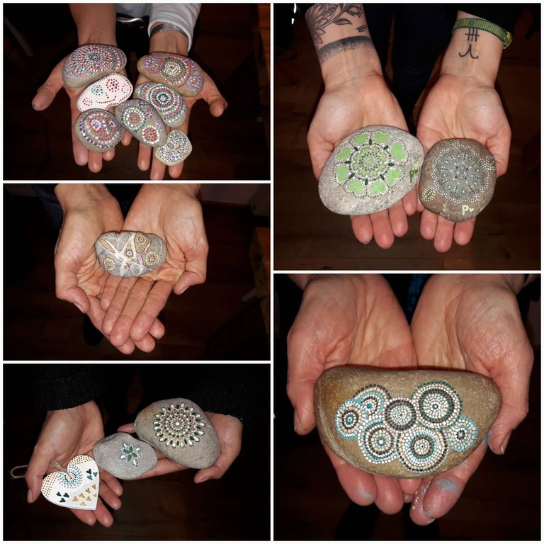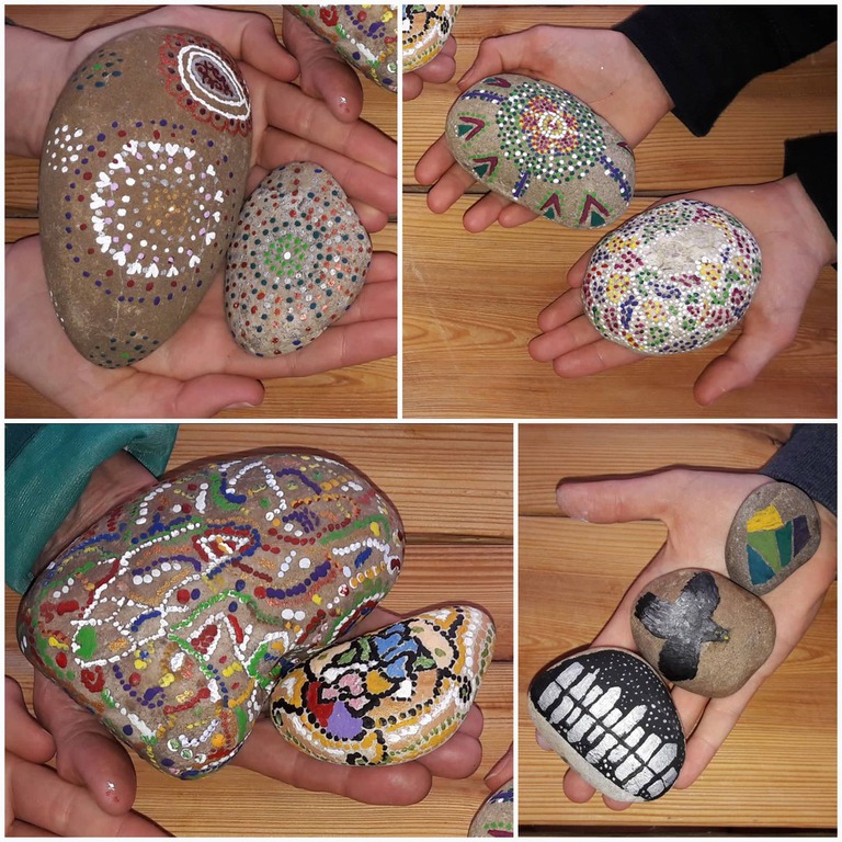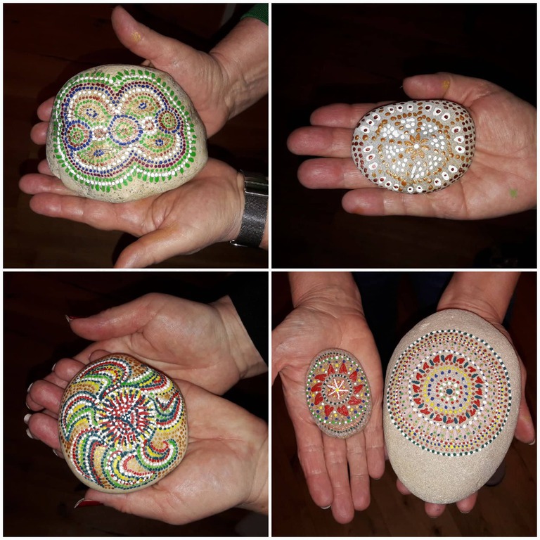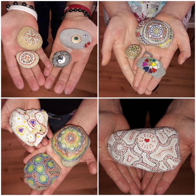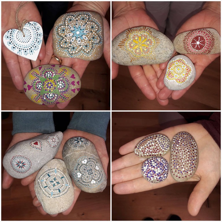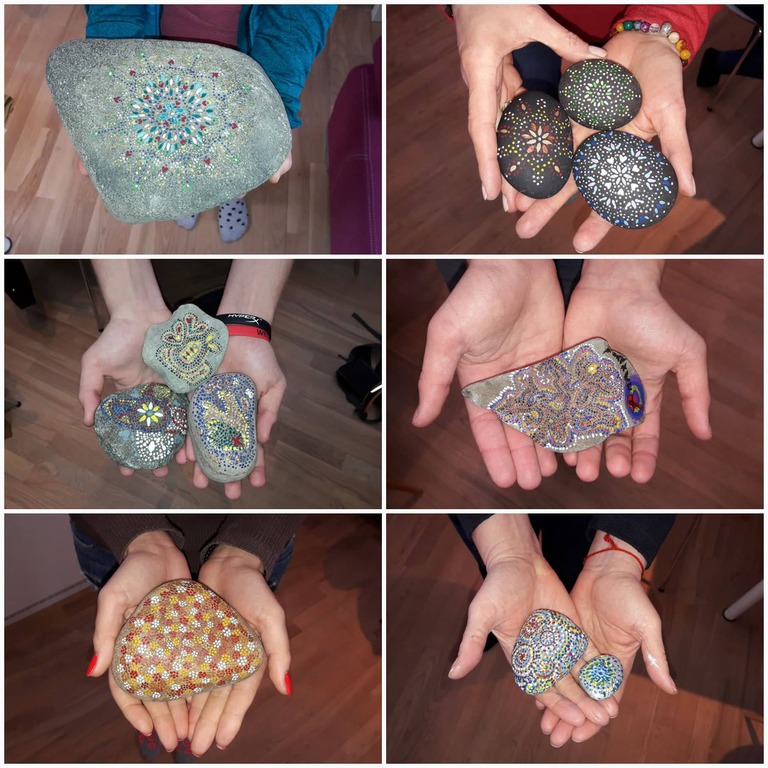 Dzieci i Mandale zmieniły moje Życie. Jak dzieci były jeszcze bardzo małe, malowałam wzory na karteczkach, szybko czułam, że zataczałam kręgi dookoła mojego własnego centrum i odczuwałam niesamowity relaks... dobrze mi robił pomiędzy zajęciami dnia, stertami ubrań do prania i różnymi wyzwaniami... Malowałam coraz wiecej i bardziej kolorowo... gdy tylko dzieci były kreatywne, siadałam i malowałam od kropki do kropki, od kręgu do kręgu... na kartkach... na płótnie... na pierwszych kamieniach... każdego wieczoru zatapiałam się w kręagch nastepnych Mandali... odpoczywałam do głębi... zaczełam malowac dla innych... od Duszy dla Duszy... ale poczułam, że nie ma ważniejszej Mandali niż tej Własnej... zaczęłam tworzyć przestrzeń podczas warsztatów, w której każdy mógł doświadczyć... tego niesamowitego zatrzymania, zatapiania się w siebie... tak siedzimy razem... każda ze swoim kamieniem i sobą na chwile sama... a cisza łączy nas wszystkie... Poprzez malowanie Mandali nauczyłam się być... być we i ze wszystkim, co mi Życie dało w darze... szczęście i cierpienie... pokorę i zaufanie... Gdy patrzę na te wszystkie Mandale, wzruszam się i czuję wdzięczność. Jest najpiękniejszą medytacją dla mnie i polecam ją każdemu. Nie potrzeba wiele... tylko KAMIEŃ, PĘDZEL, FARBY i CIEBIE...