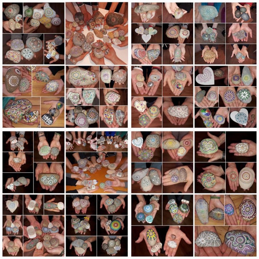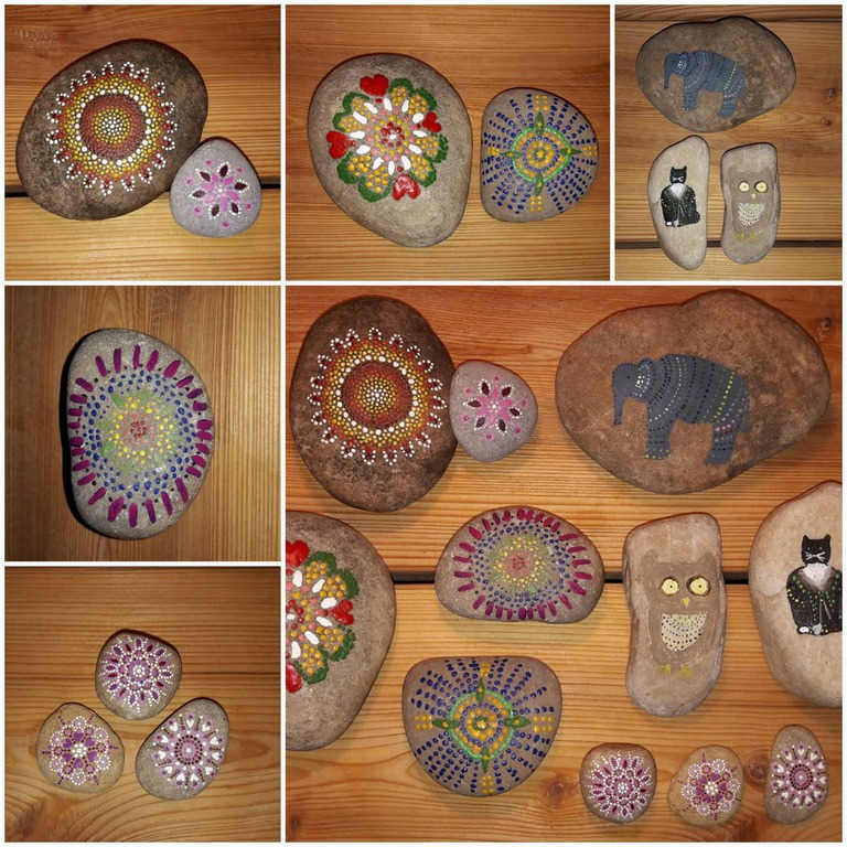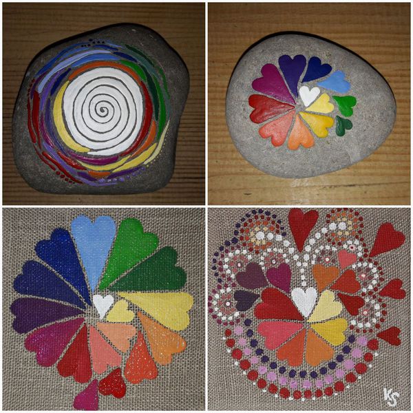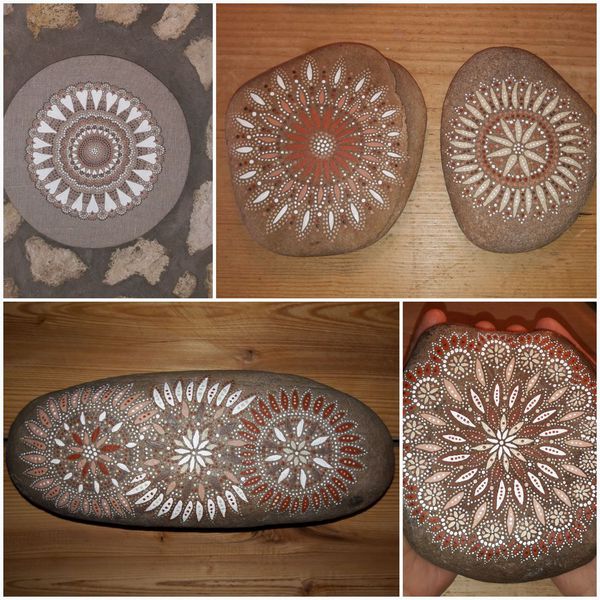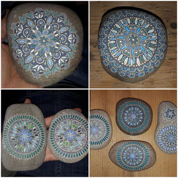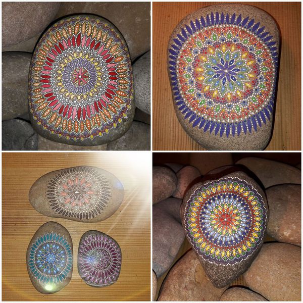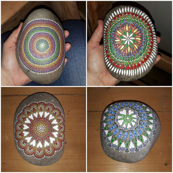 Kinder und Mandalas haben mein Leben verändert. Die Kinder waren noch sehr klein... da malte ich Muster mit dem Bleistift auf Zetteln... Sehr schnell merkte ich, dass ich Kreise zog um meine eigene Mitte und eine Art Entspannung erfuhr, die mir gut tat... inmitten von täglichen Aufgaben, Wäschebergen und verschiedenen Herausforderungen... Das Malen wurde immer mehr und immer bunter, sobald die Kinder kreativ waren, setzte ich mich hin und malte von Punkt zu Punkt, von Kreis zu Kreis... auf Blättern... auf Leinwänden... dann malte ich die ersten Steine. Jeden Abend vertiefte ich mich in die Kreise um eine Mitte und erholte mich unbeschreiblich tief... ich fing an, für Andere zu malen, um sie zu unterstützen... von Herz zu Herz... doch ich merkte, dass es kein bedeutsameres Mandala gibt als das Eigene... so bot ich die ersten Kurse an... erschuf einen Rahmen, in dem es jeder erfahren konnte... dieses unbeschreibliche Innehalten, das In-Sich-Hineinsinken, wenn wir so da sitzen... jede mit ihrem Stein und mit sich selbst für einen Augenblick allein... die Stille verbindet uns... Durch das Mandalamalen habe ich das Sein gelernt... das Sein in und mit all dem, was mir das Leben an Glück und Leid, Demut und Zuversicht geschenkt hat... Wenn ich die vielen Mandalas sehe, berührt es mich und erfüllt mit Dankbarkeit. Es ist eine der schönsten Meditationen für mich, die ich jedem empfehle... Es braucht nicht viel... einen STEIN, einen PINSEL, FARBEN und DICH...