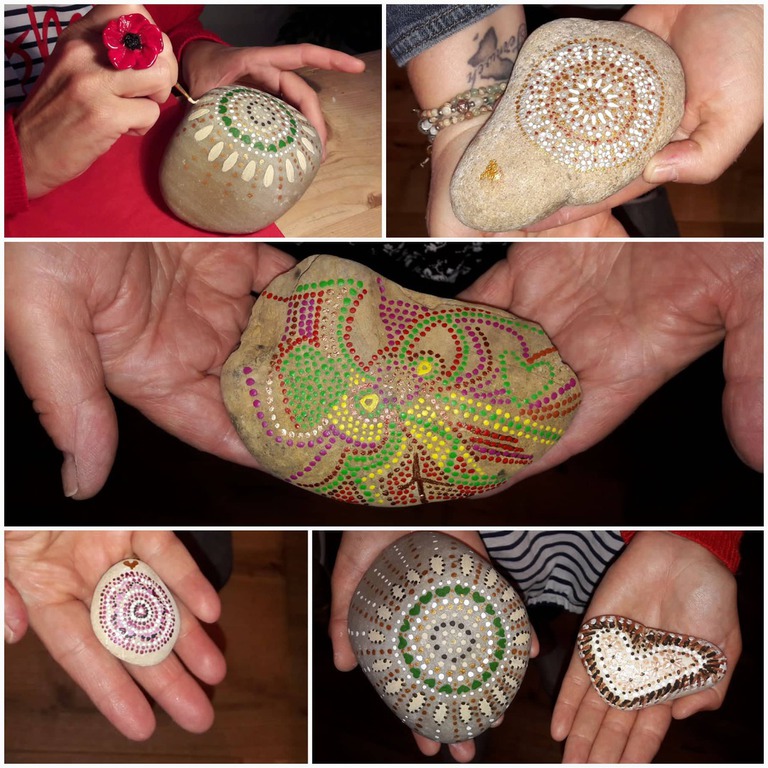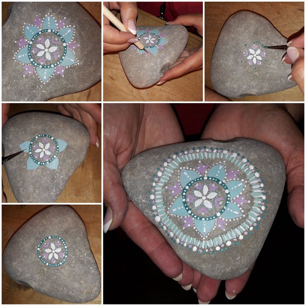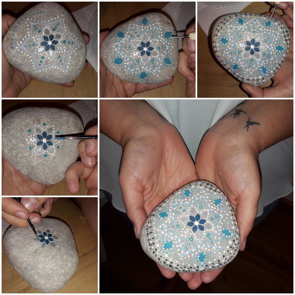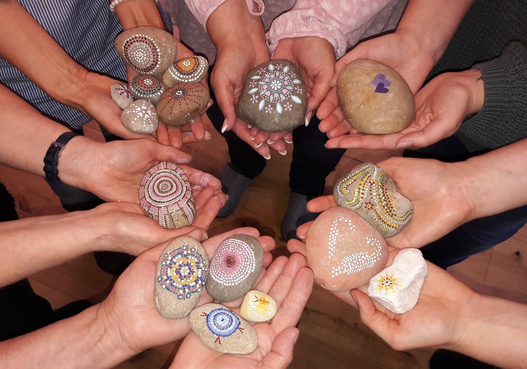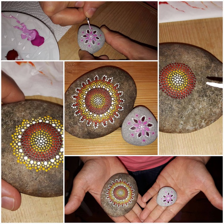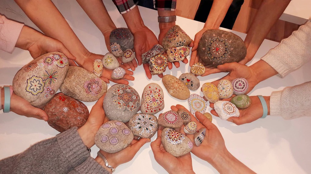 Kinder und Mandalas haben mein Leben verändert. Die Kinder waren noch sehr klein... da malte ich Muster mit dem Bleistift auf Zetteln... Sehr schnell merkte ich, dass ich Kreise zog um meine eigene Mitte und eine Art Entspannung erfuhr, die mir gut tat... inmitten von täglichen Aufgaben, Wäschebergen und verschiedenen Herausforderungen... Das Malen wurde immer mehr und immer bunter, sobald die Kinder kreativ waren, setzte ich mich hin und malte von Punkt zu Punkt, von Kreis zu Kreis... auf Blättern... auf Leinwänden... dann malte ich die ersten Steine. Jeden Abend vertiefte ich mich in die Kreise um eine Mitte und erholte mich unbeschreiblich tief... ich fing an, für Andere zu malen, um sie zu unterstützen... von Herz zu Herz... doch ich merkte, dass es kein bedeutsameres Mandala gibt als das Eigene... so bot ich die ersten Kurse an... erschuf einen Rahmen, in dem es jeder erfahren konnte... dieses unbeschreibliche Innehalten, das In-Sich-Hineinsinken, wenn wir so da sitzen... jede mit ihrem Stein und mit sich selbst für einen Augenblick allein... die Stille verbindet uns... Durch das Mandalamalen habe ich das Sein gelernt... das Sein in und mit all dem, was mir das Leben an Glück und Leid, Demut und Zuversicht geschenkt hat... Wenn ich die vielen Mandalas sehe, berührt es mich und erfüllt mit Dankbarkeit. Es ist eine der schönsten Meditationen für mich, die ich jedem empfehle... Es braucht nicht viel... einen STEIN, einen PINSEL, FARBEN und DICH...