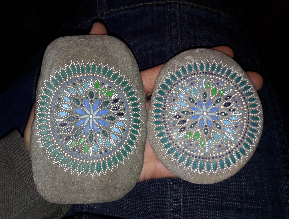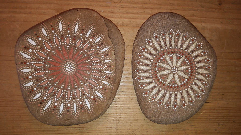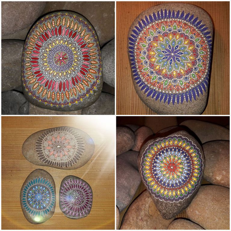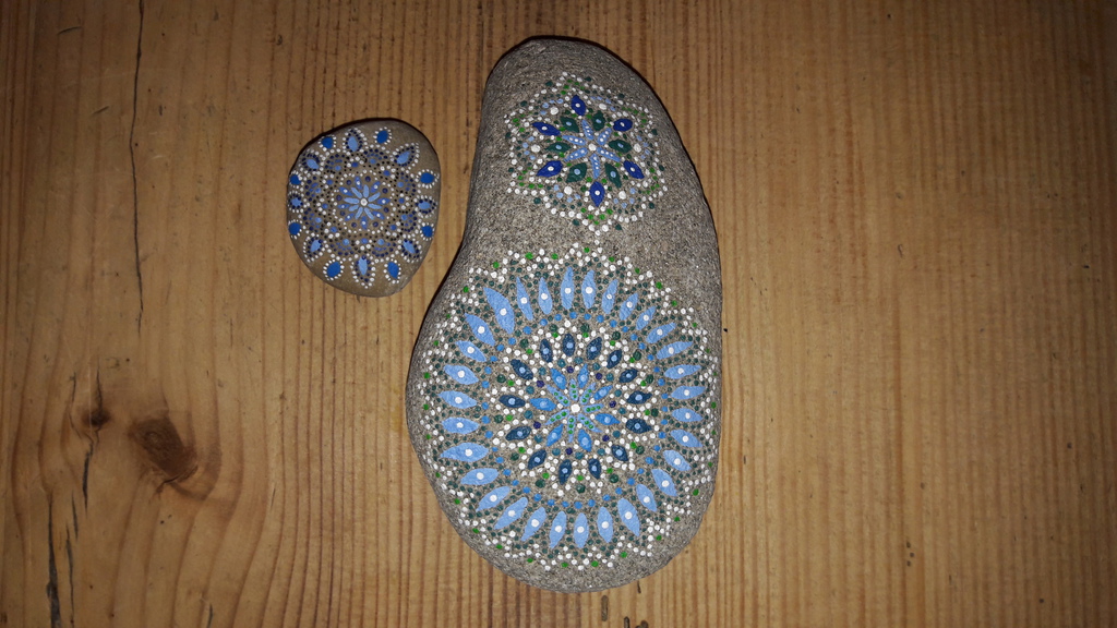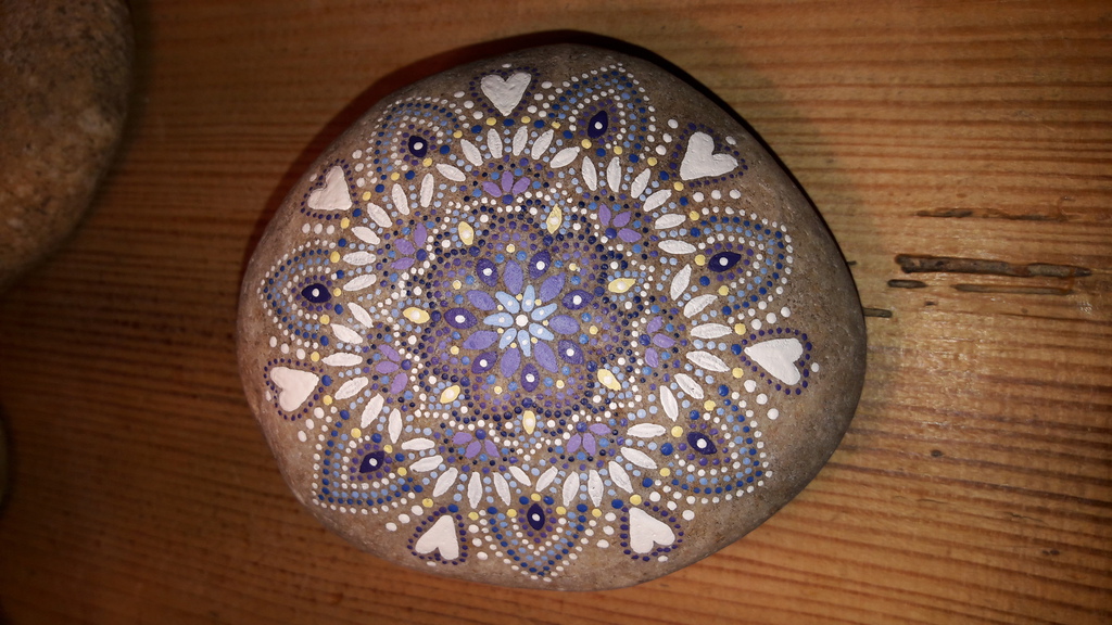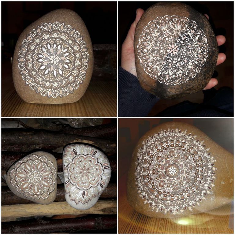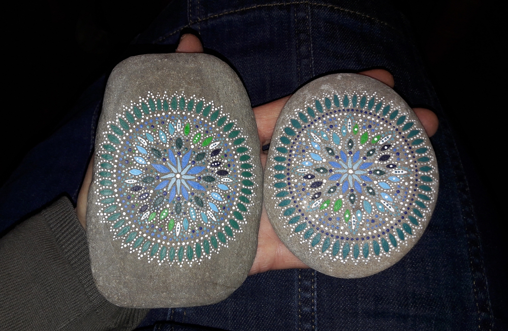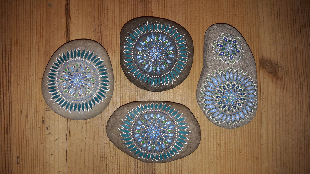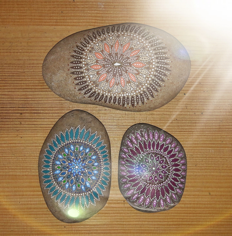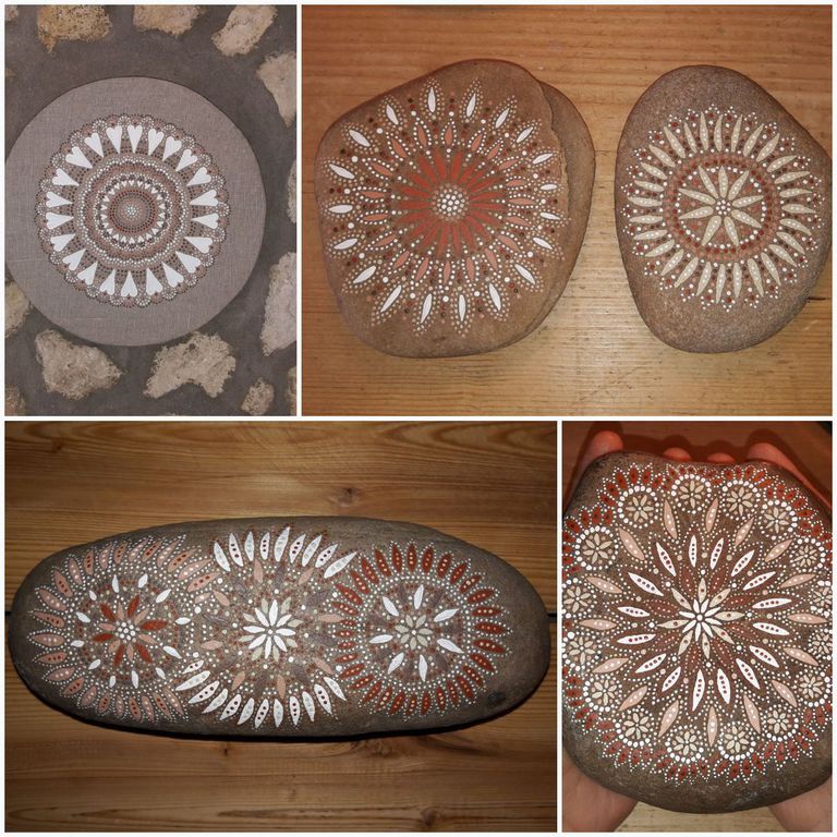 male ich Mandalas auf Steinen und auf Naturleinen.