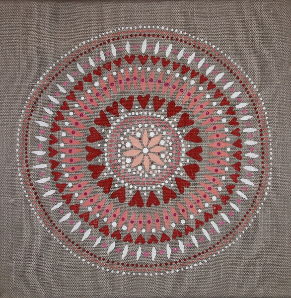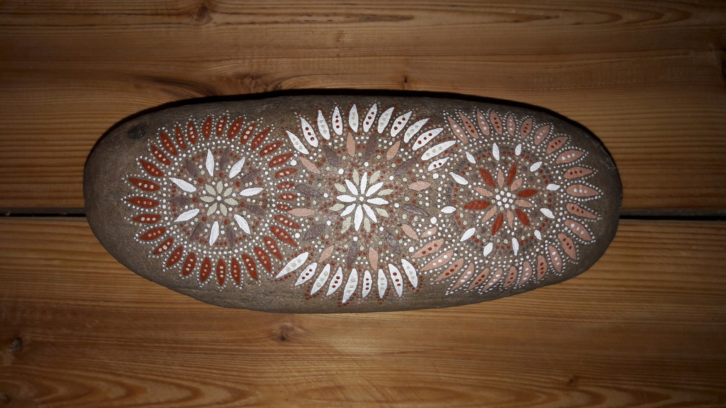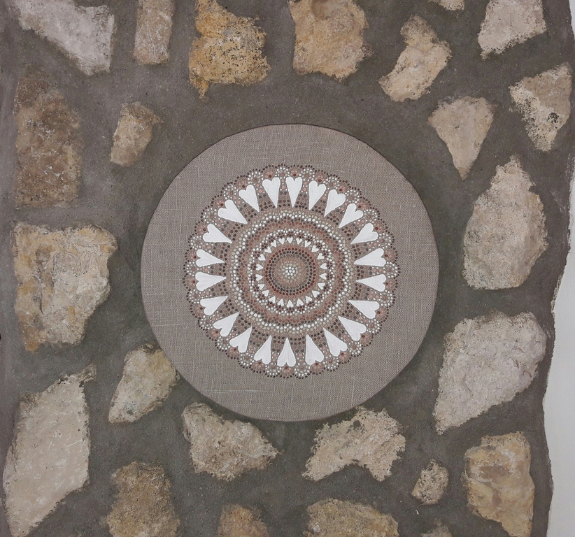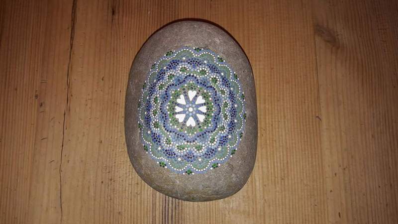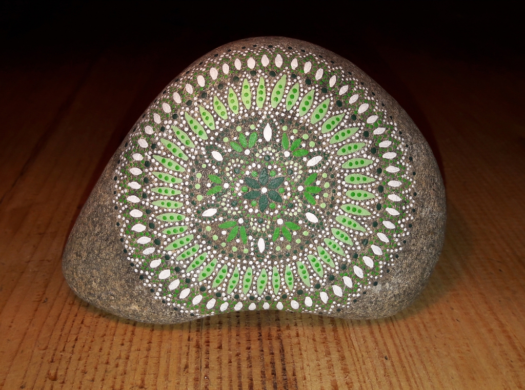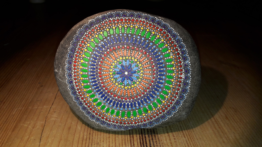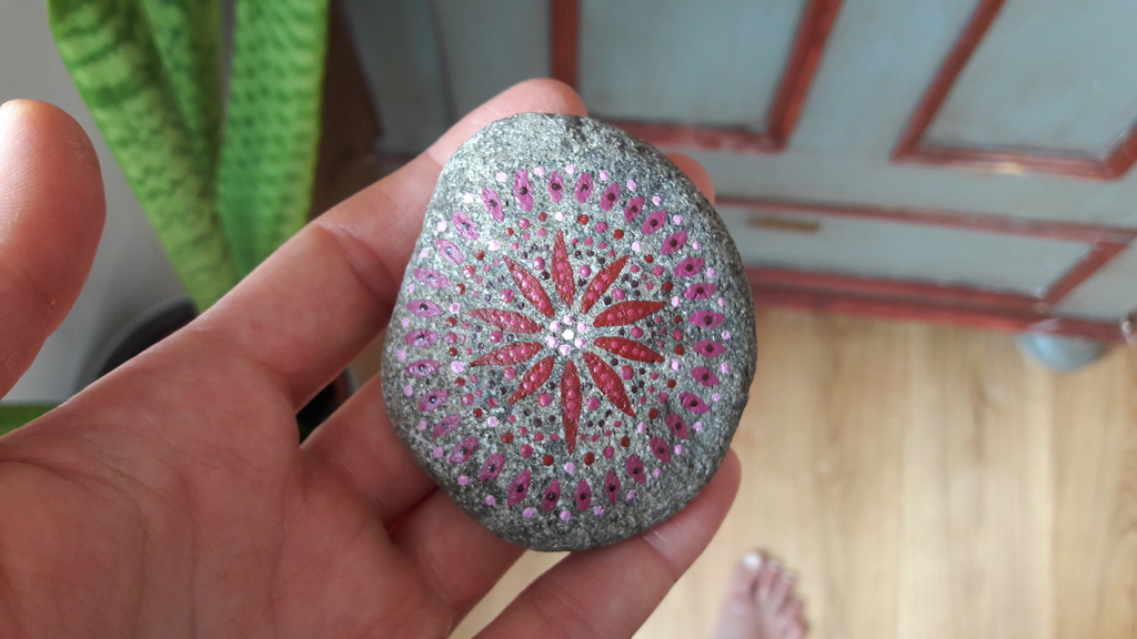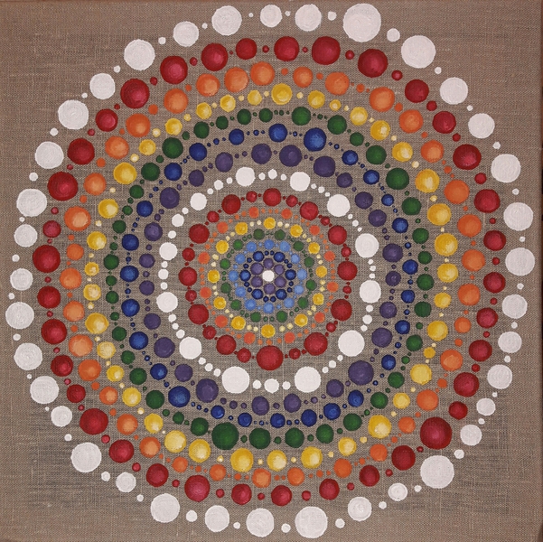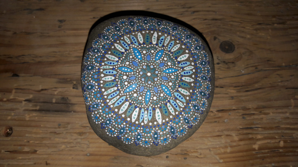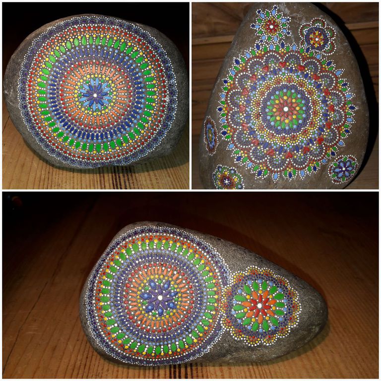 male ich Mandalas auf Steinen und auf Naturleinen.