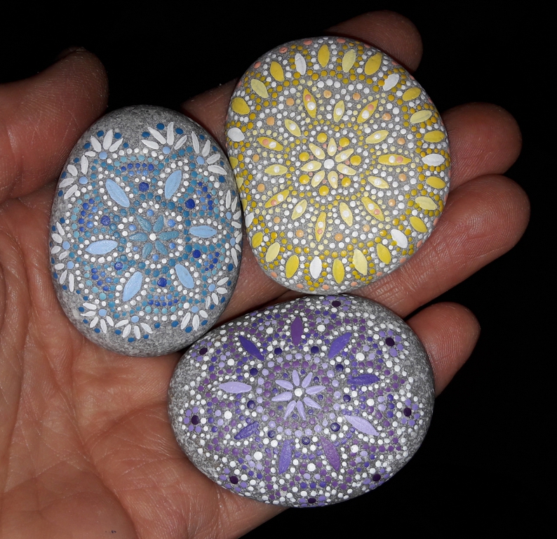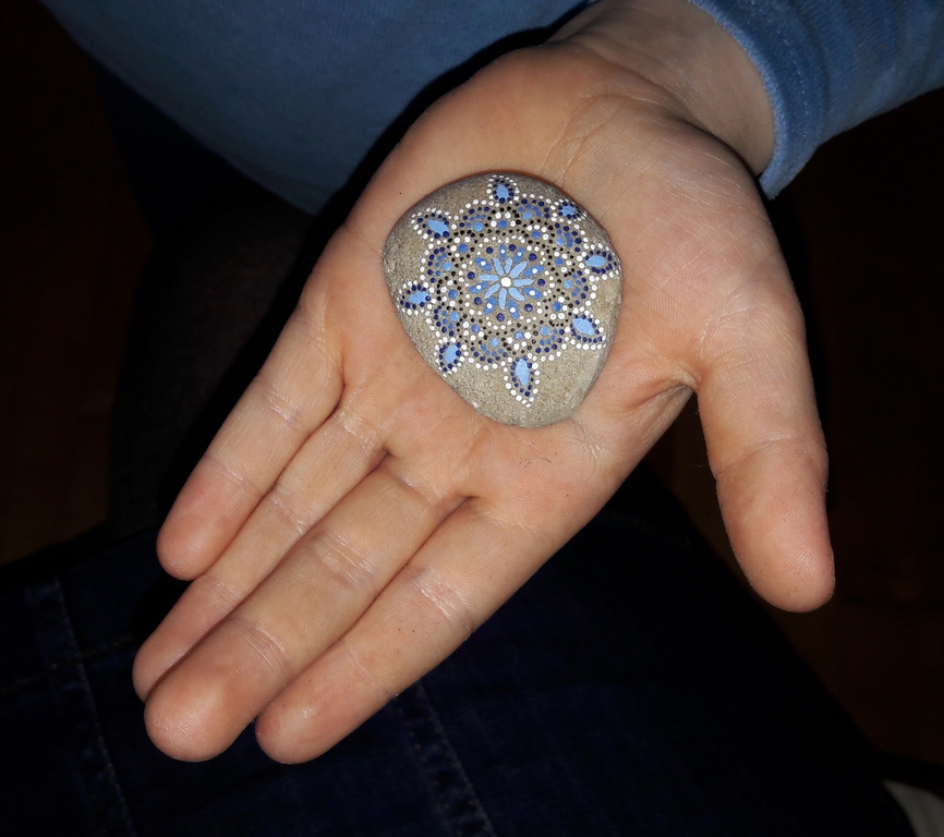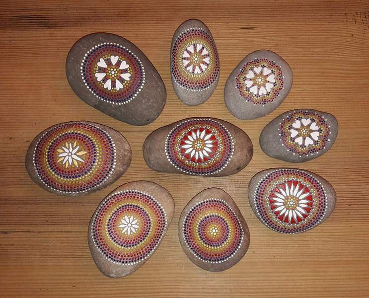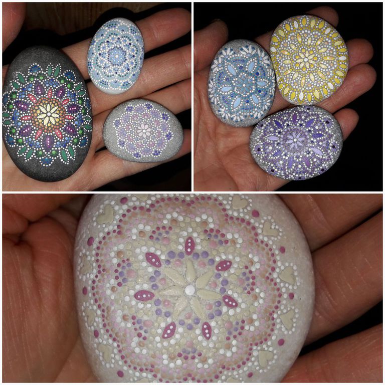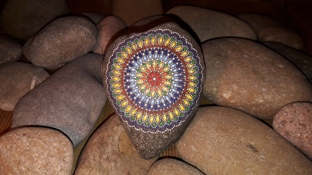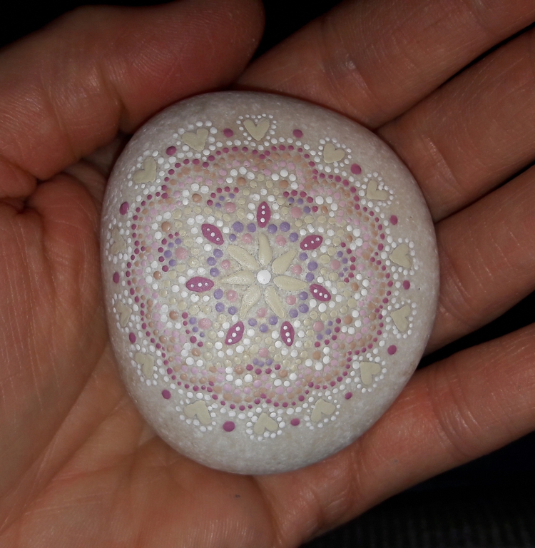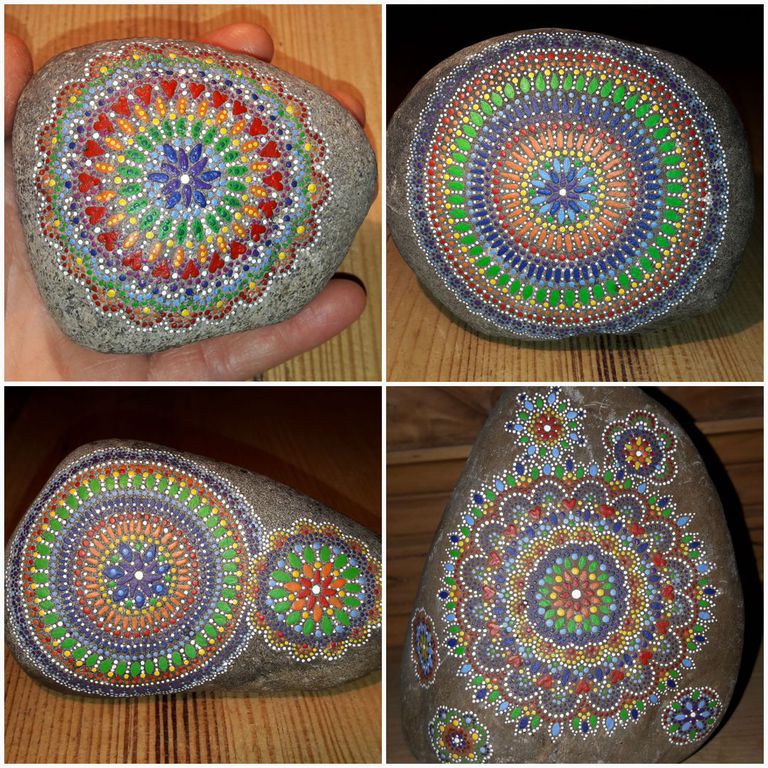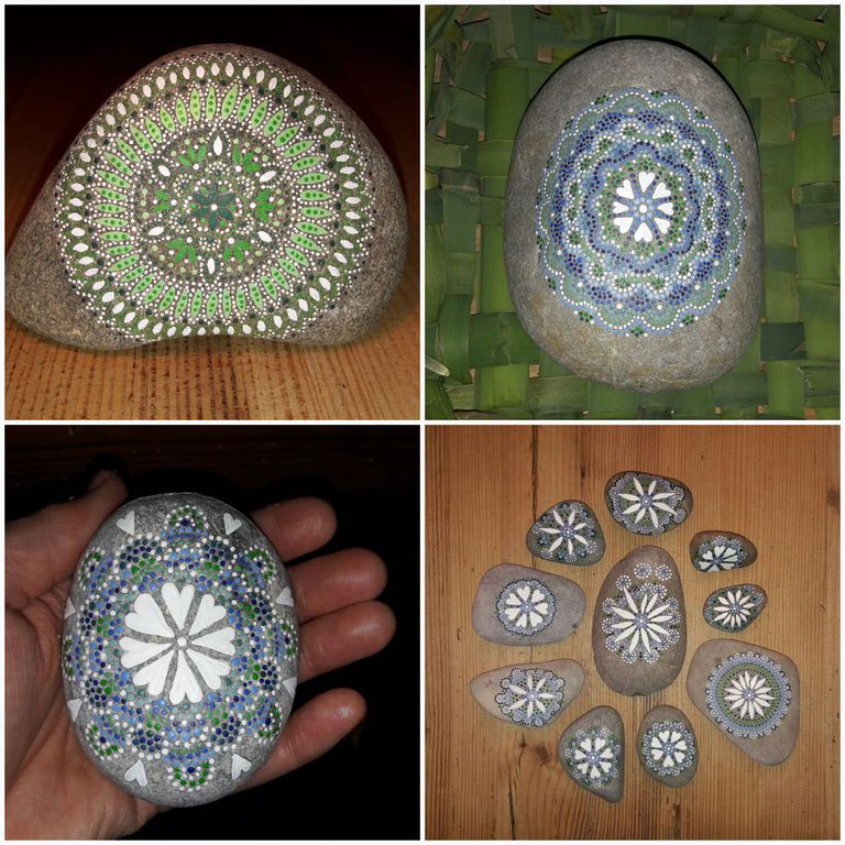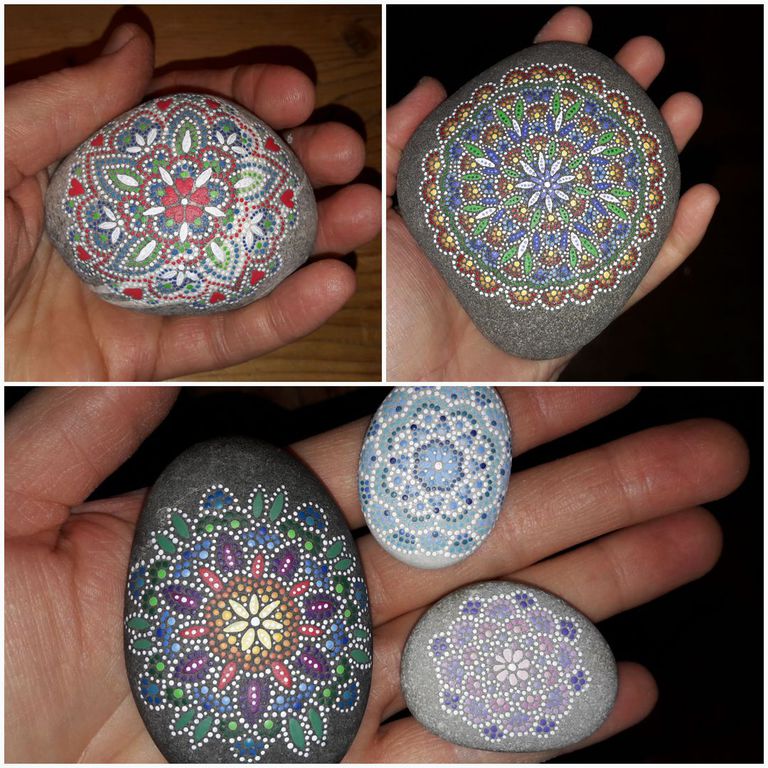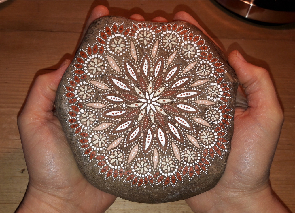male ich Mandalas auf Steinen und auf Naturleinen.