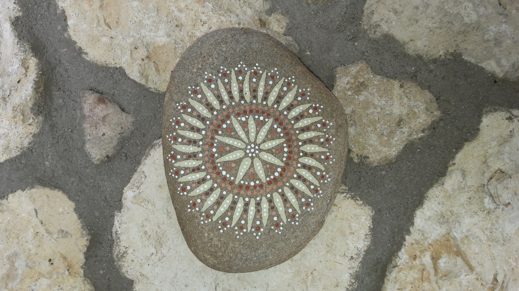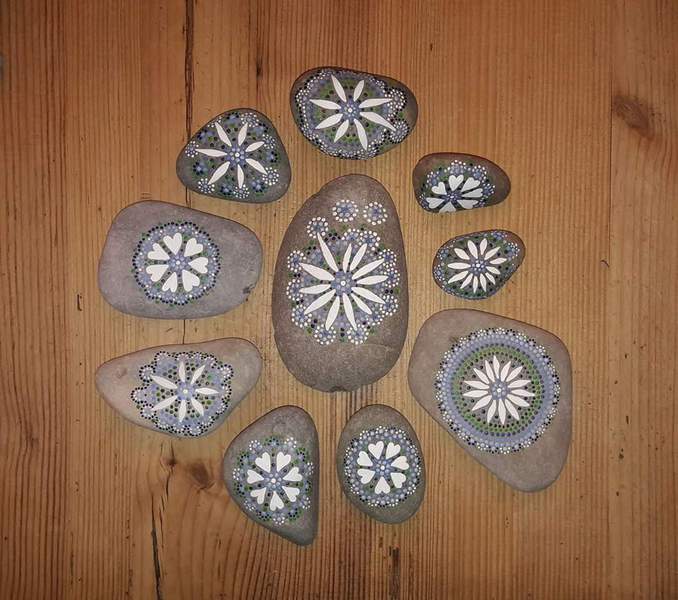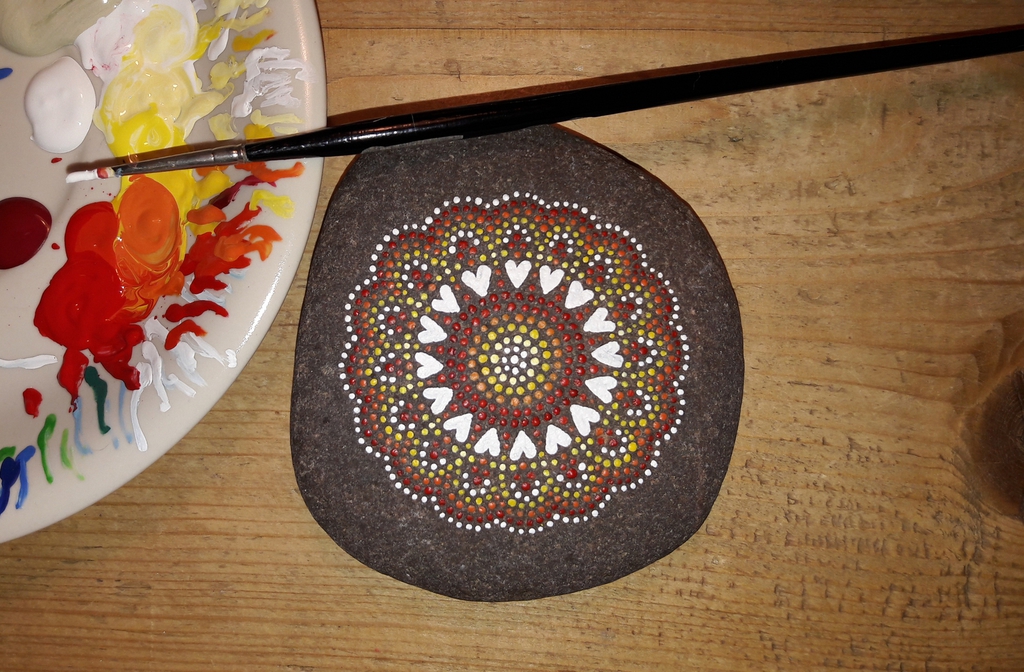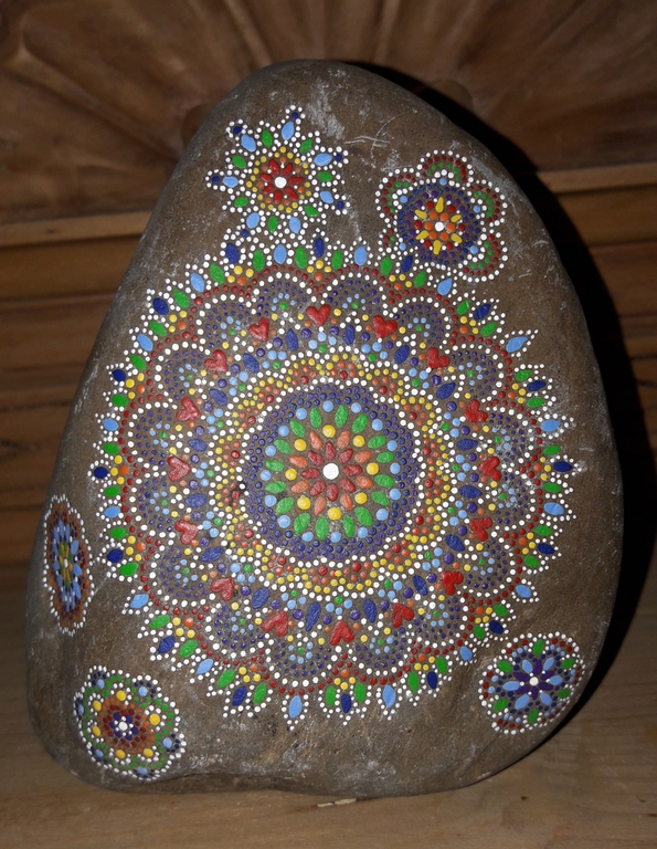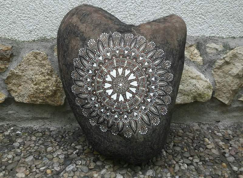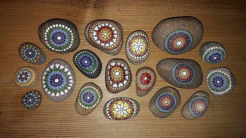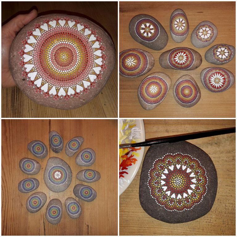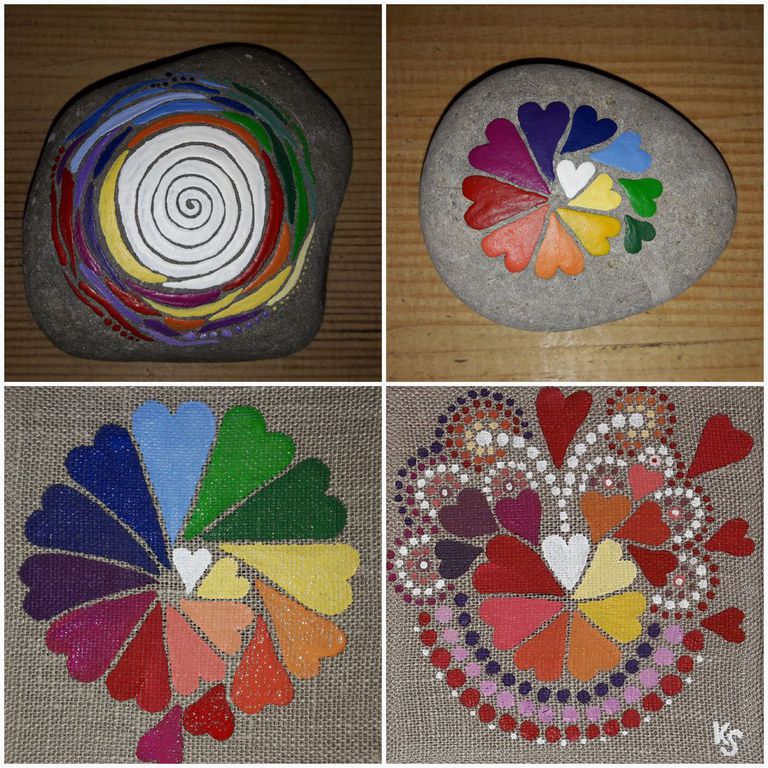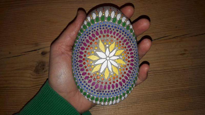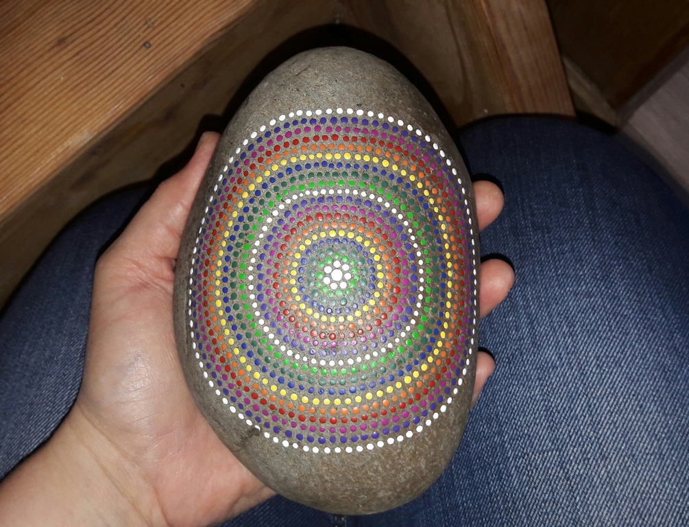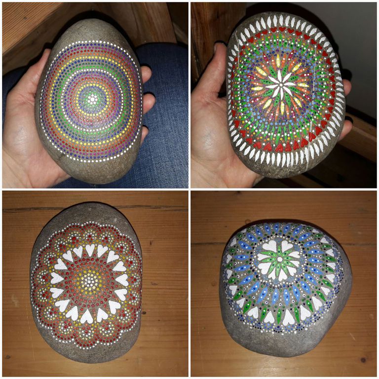 male ich Mandalas auf Steinen und auf Naturleinen.
